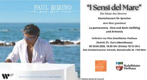 Der gemeinnützige Kulturverein La pomarancia – Eins und doch vielfältig in Kooperation mit dem Musikverein Armonia präsentiert am Mi 29. April 2026, 18:30-20 Uhr in der Alten Schieberkammer Schmelz im 15. Wiener Bezirk "I sensi del mare" (Die Sinne des Meeres): Eine Aufführung mit originaler Musik des Pianisten und Komponisten Paul Robino, arrangiert und produziert vom Maestro Vince Tempera ...